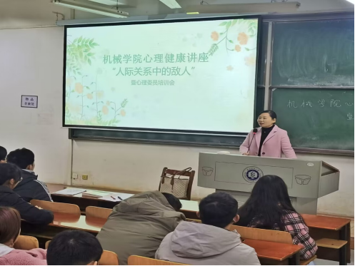 为了更好提高大学生的自我心理防护意识,心理危机预防和应对能力,机械工程与自动化学院心理健康指导老师王娟开展讲座,于YG03-119下午六点到七点给各班心理委员及寝室长开展讲座——《人际关系中的敌人》。