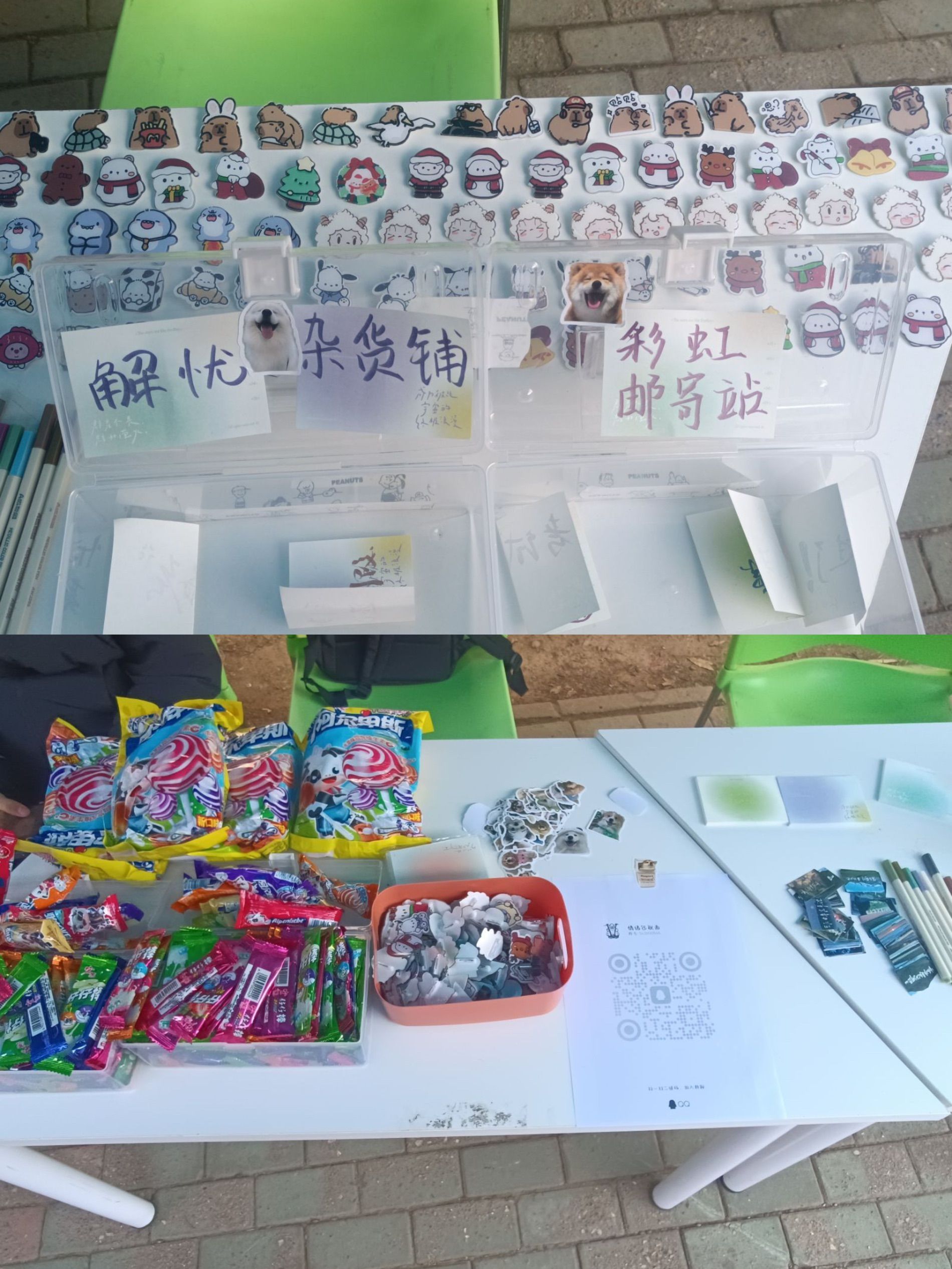 活动分为三个部分:彩虹邮寄站、解忧杂货铺、Film心灵放映室。为了活动能够更好的进行,部门精心准备了精美的卡纸、彩笔,并且提供了写有激励语句的贴纸代替胶带。在同学们完成活动后,负责摆点的同学还会送上漂亮的小别针和棒棒糖作为礼品。
