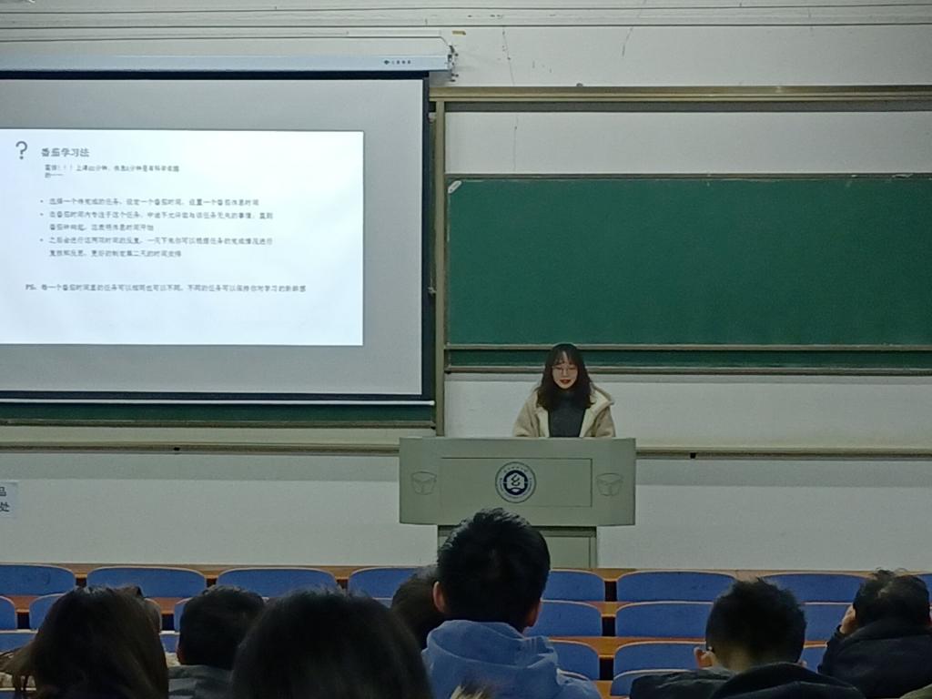讲座伊始,白静文同学从有效时间、专注力、拖延症三个方面分别进行讲解。紧接着又向同学们分享充分利用课堂时间、制定学习计划、番茄学习法等有效提高学习效率的方法。同时,白静文同学提出提高专注力主要有两点:第一,先学习再玩;第二,建立奖励机制,要快乐学习。