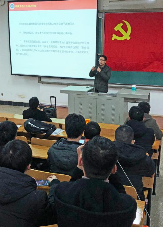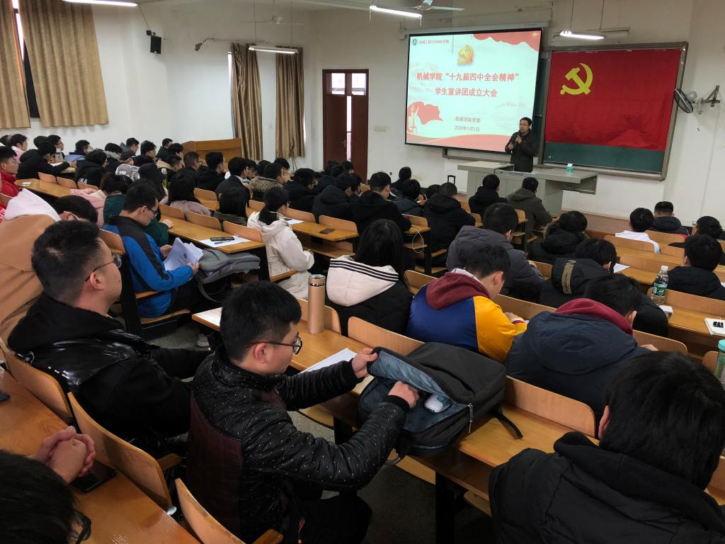 在成立大会上,刘韦副书记作动员讲话,要求学院全体学生党员和入党积极分子寒假离校前提交全会精神学习心得体会;寒假假期回到家后在家乡(或假期所在地)宣讲全会精神。刘书记明确要求大家加强学习,深刻、全面认识我国国家制度和国家治理体系所具有的多方面的显著优势,利用假期对十九届四中全会精神进行广泛深入地宣讲,带动身边亲友和群众更加紧密地团结在以习近平同志为核心的党中央周围,坚定信心,开拓创新,为坚持和完善中国特色社会主义制度,实现“两个一百年”奋斗目标、实现中华民族伟大复兴的中国梦而努力奋斗!
