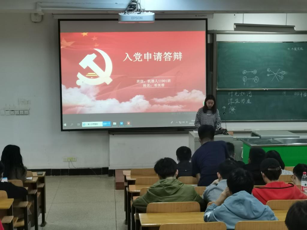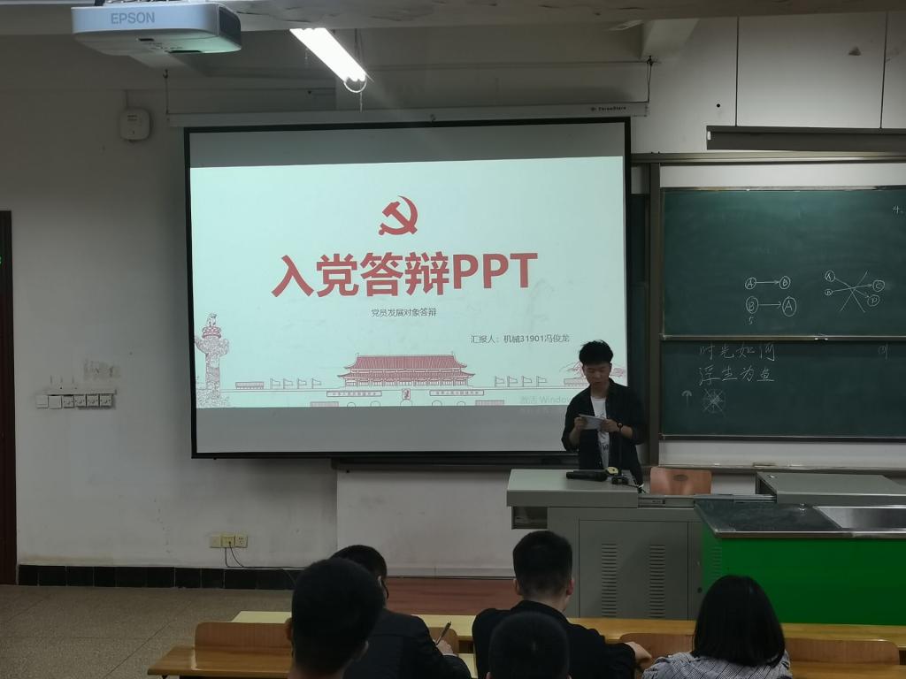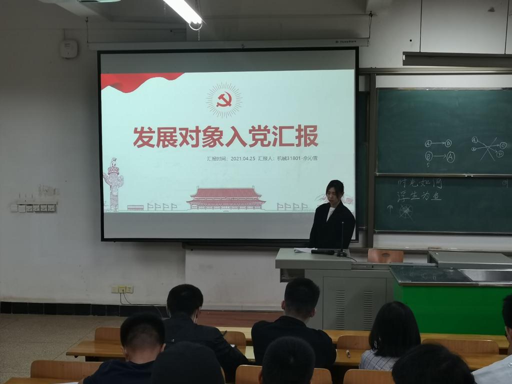 经班级团支部推选的江欣远、邓芙蓉、杨林青、曾令辉、钱思颖、蔡大海、王英杰、冯俊龙、李江洲、王子亮、杨州、佘沁雪、胡春华等13名发展对象候选人逐一展开答辩,答辩形式为PPT汇报和评委提问,同学们阐述了思想觉悟、知识学习、成长历练、为民服务、荣誉成果等各方面的内容,回答了党史等知识问题。