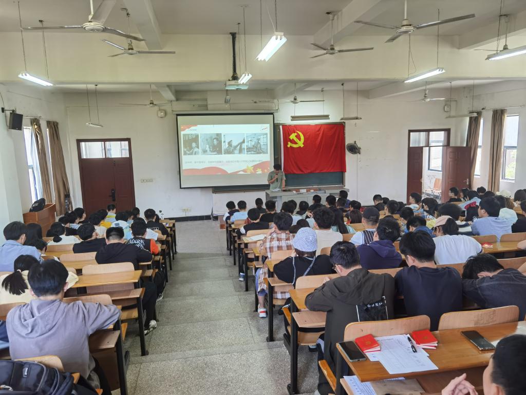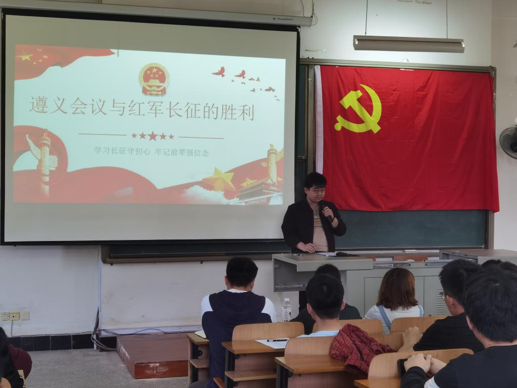 然后,机械学生第一党支部预备党员卢国盛同志给大家讲解了关于“遵义会议与红军长征的胜利”党史故事。他声情并茂地为大家讲解了长征的历史背景和战略意义,展示了长征的行军路线和艰苦场面。在他的介绍下,同学们对红军长征这段可歌可泣的历史有了更加深入全面的认识,领悟了要坚定信念、严守纪律、艰苦奋斗的长征精神和以爱国主义为核心的民族精神。