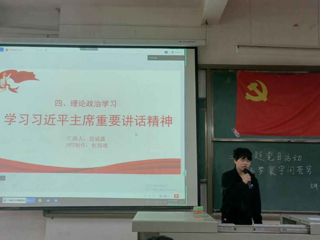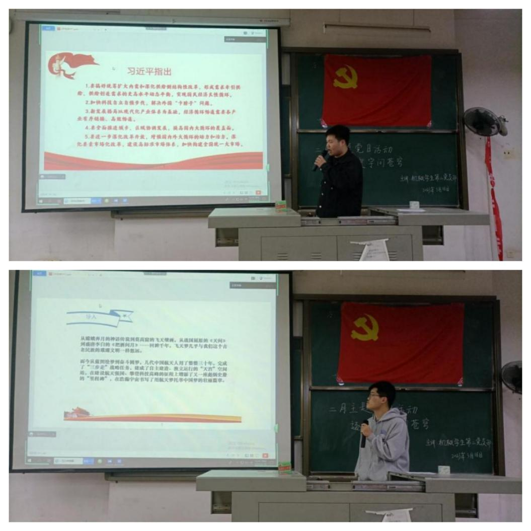贺成鑫同学领学了习近平总书记重要讲话精神,带领学生党员立志在新时代新征程贡献出自己的一份力量。熊拓同学为大家介绍了我国载人航天航空的发展,详细讲解了中国载人航空工程的历程和重要意义,更加坚定了大家科技报国的远大志向。载人航天是新时代强国的体现,它代表了一个国家科技实力和综合国力。